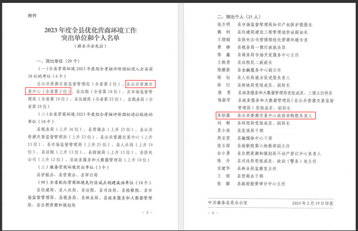 2023年获全县优化营商环境工作突出单位荣誉称号;职工朱怡霖获全县优化营商环境工作突出个人荣誉称号;优化营商环境评价招标投标指标全省排名第2位,较2022年上升23位,连续两年进入全省第一方阵!