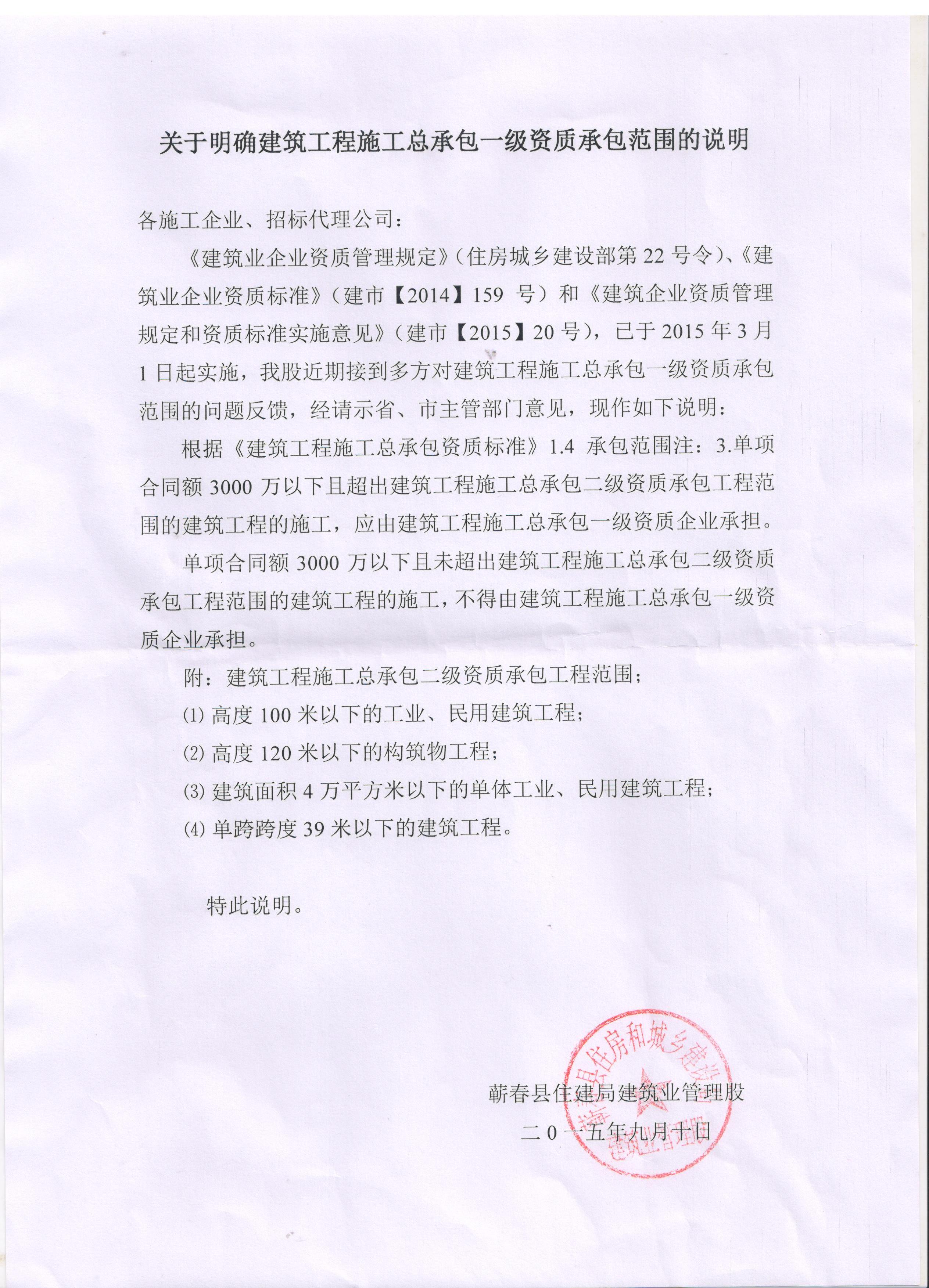 关于明确建筑工程施工总承包一级资质承包范围的说明
